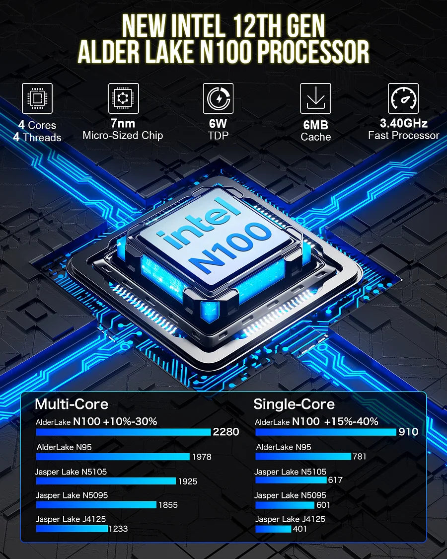 (1) Efficienza Energetica: Intel N100 (4C/4T) – Solo 6W di Consumo