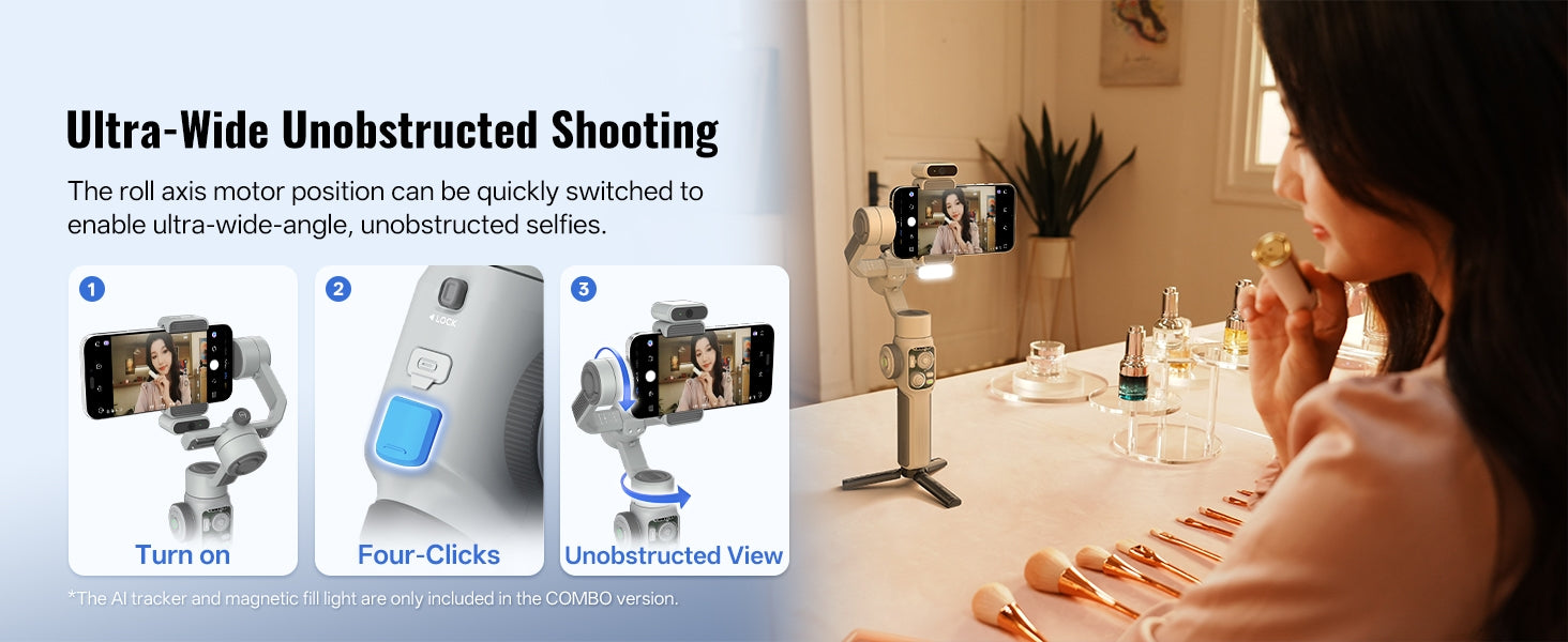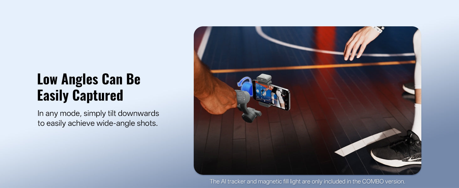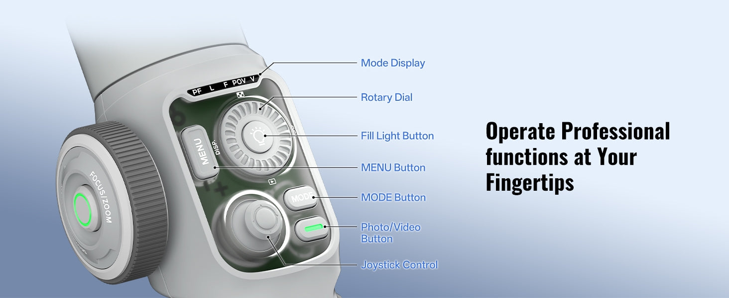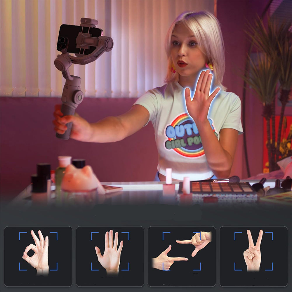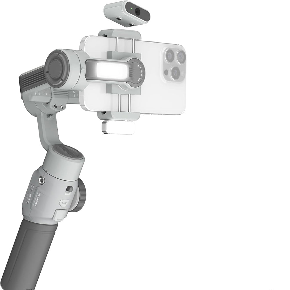 Design cinematografico a 3 assi elimina vibrazioni. 5 modalità (Pan-Follow, POV, Vortex) per vlog in movimento e azione – compatibile con iPhone 15/14, Samsung S23 e Pixel 8 (fino a 300g).