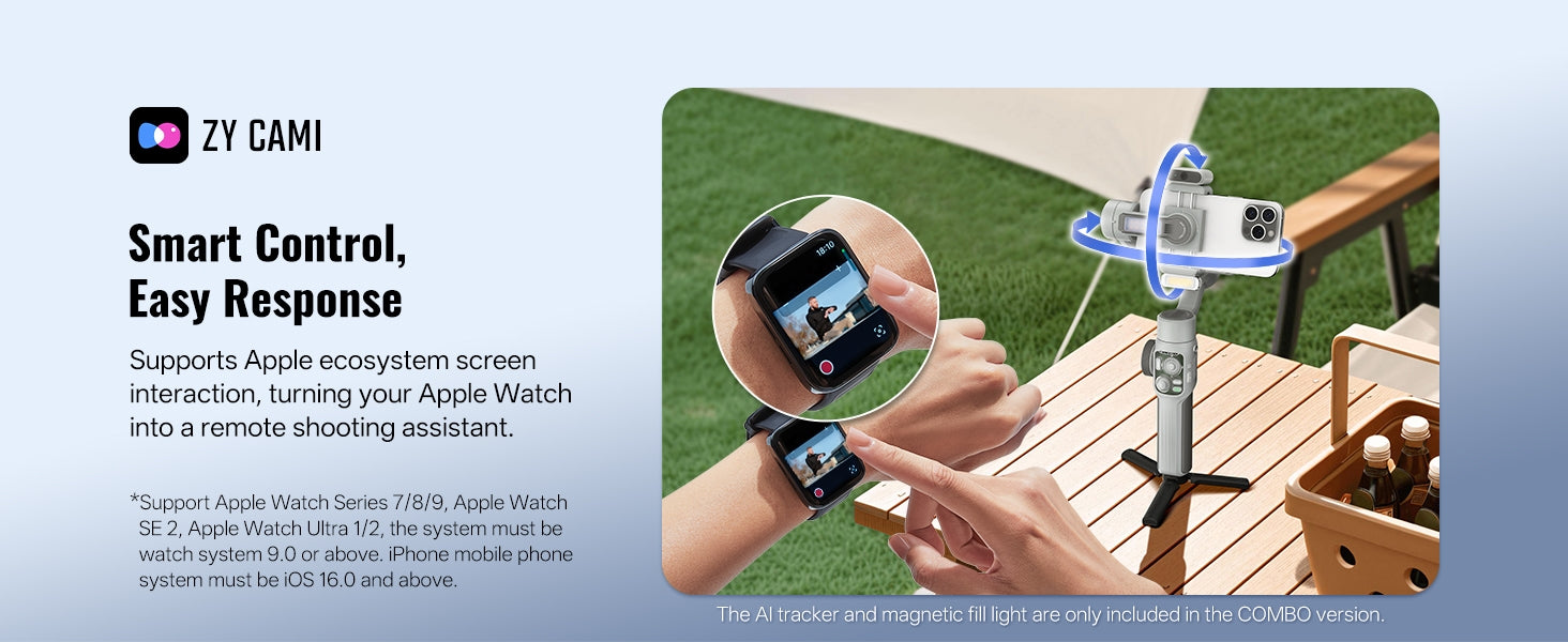 Gestisci zoom e registrazione con Apple Watch (Series 7+). Effetti professionali automatici.