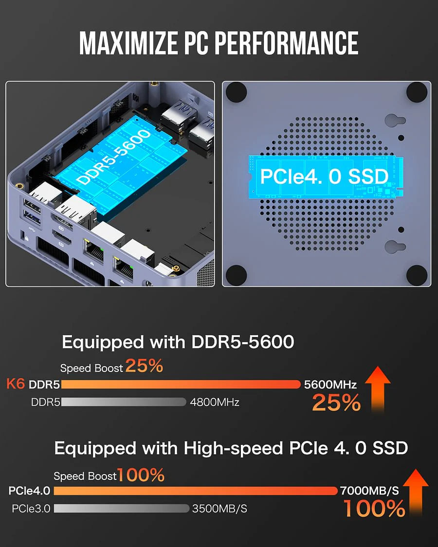 Alimentato da processori all'avanguardia per la massima potenza di calcolo. I nostri mini-PC offrono prestazioni a livello desktop in un formato compatto, perfetto per lavoro e intrattenimento.