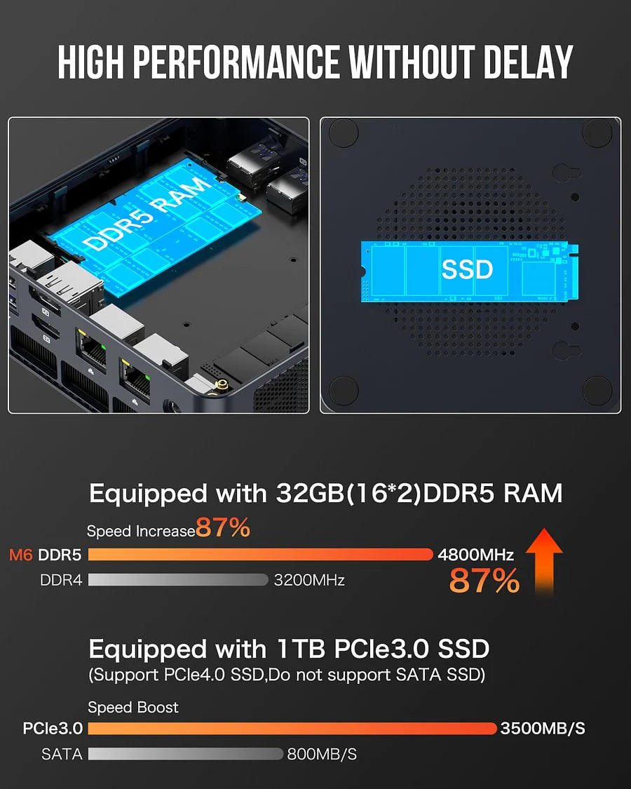 Alimentato da processori all'avanguardia per la massima potenza di calcolo. I nostri mini-PC offrono prestazioni a livello desktop in un formato compatto, perfetto per lavoro e intrattenimento.