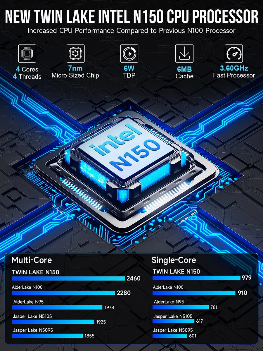 (1) CPU Intel N150 ad Alte Prestazioni: Fino a 3.6GHz con Grafica Intel UHD, ideale per un server personale, router o centro media.