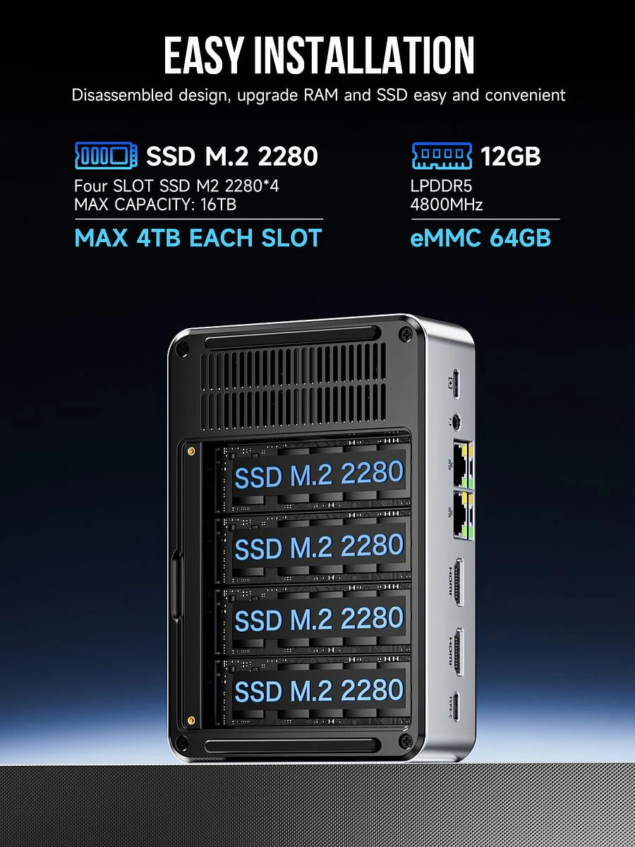 (2) Storage Massivo e Espandibilità: Quattro slot NVMe M.2 2280 che supportano fino a 16TB totali (4x 4TB), ideale per backup e hosting di file.
