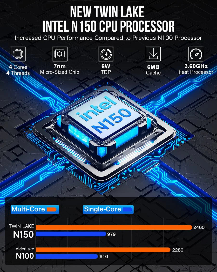 (1) Processore Intel Twin Lake N150: 4 core/4 thread, fino a 3.6 GHz, ideale per computer da ufficio e domestici.