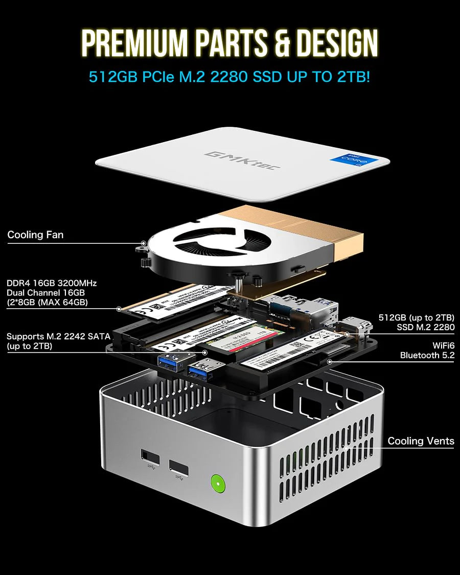 (2) Massime Opzioni di Memoria e Archiviazione: Configurazioni: barebone, 16 GB/32 GB DDR4 + 512 GB/1 TB NVMe; espandibile fino a 64 GB di RAM e 2 TB di SSD.