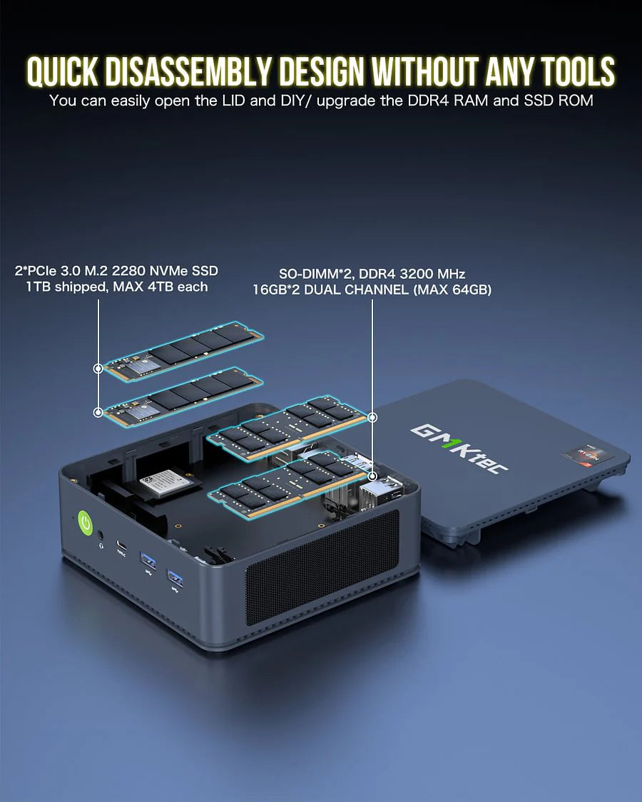 (3) RAM e Archiviazione Personalizzabili: Scegli barebone o preconfigurato con 32 GB DDR4 + 1 TB NVMe, espandibile fino a 64 GB di RAM + 4 TB di archiviazione.