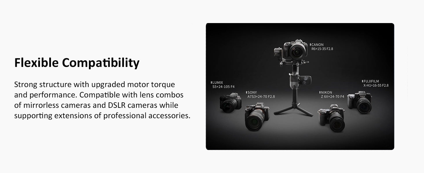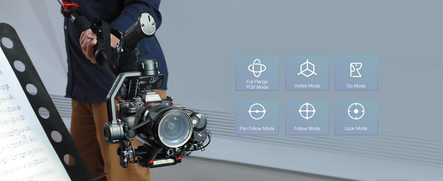 Algoritmo avanzato elimina le micro-vibrazioni in condizioni veloci o ventose. Supporta Sony A7IV, Canon R5 e BMPCC 6K (fino a 3,2 lbs di carico).