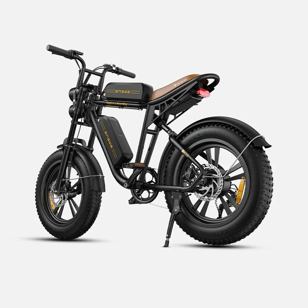 (4) Configurazione ad Alte Prestazioni: La ENGWE M20 presenta una trasmissione a 7 velocità, freni a disco Tektro M280 da 160 mm, pneumatici grassi da 20 x 4 pollici, un pignone in alluminio da 46 denti e pedali in alluminio. Questa configurazione premium assicura prestazioni senza compromessi e un'esperienza di guida eccezionale.